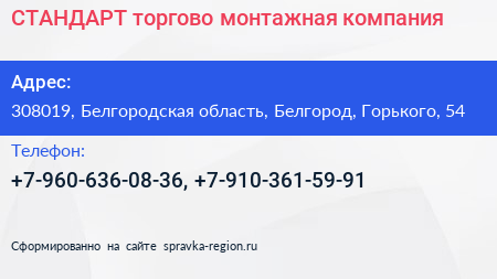 СТАНДАРТ, торгово-монтажная компания по адресу 308019, Белгородская область, Белгород, Горького, 54 в дальнейшем Организация, размещена в следующих категориях: