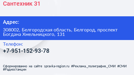 Сантехник-31 по адресу 308002, Белгородская область, Белгород, проспект Богдана Хмельницкого, 131 в дальнейшем Организация, размещена в следующих категориях: