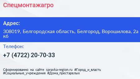 Спецмонтажагро по адресу 308019, Белгородская область, Белгород, Ворошилова, 2а к6 в дальнейшем Организация, размещена в следующих категориях: