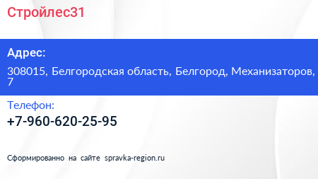 Стройлес31 по адресу 308015, Белгородская область, Белгород, Механизаторов, 7 в дальнейшем Организация, размещена в следующих категориях: