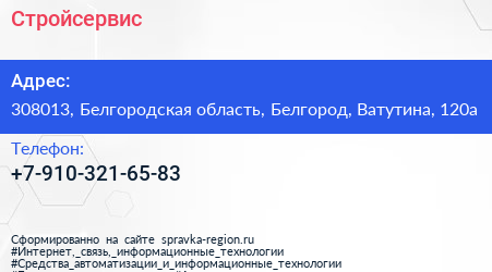 Стройсервис по адресу 308013, Белгородская область, Белгород, Ватутина, 120а в дальнейшем Организация, размещена в следующих категориях: