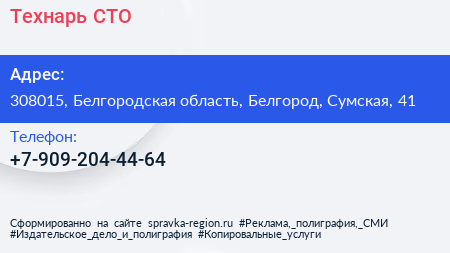 Технарь, СТО по адресу 308015, Белгородская область, Белгород, Сумская, 41 в дальнейшем Организация, размещена в следующих категориях: