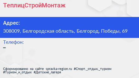 ТеплицСтройМонтаж по адресу 308009, Белгородская область, Белгород, Победы, 69 в дальнейшем Организация, размещена в следующих категориях: