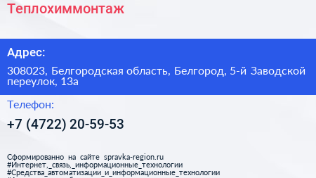 Теплохиммонтаж по адресу 308023, Белгородская область, Белгород, 5-й Заводской переулок, 13а в дальнейшем Организация, размещена в следующих категориях: