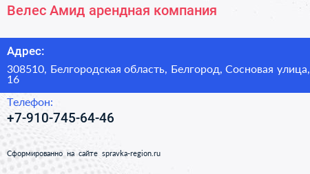 Велес-Амид, арендная компания по адресу 308510, Белгородская область, Белгород, Сосновая улица, 16 в дальнейшем Организация, размещена в следующих категориях: