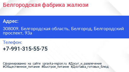 Белгородская фабрика жалюзи по адресу 308009, Белгородская область, Белгород, Белгородский проспект, 93а в дальнейшем Организация, размещена в следующих категориях: