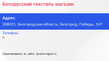 Белорусский текстиль, магазин по адресу 308015, Белгородская область, Белгород, Победы, 147 в дальнейшем Организация, размещена в следующих категориях: