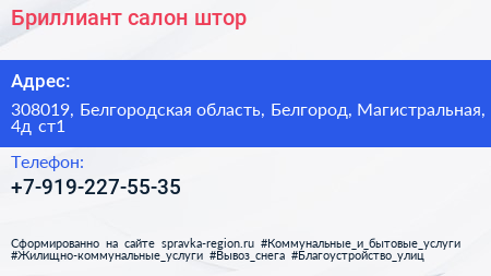 Бриллиант, салон штор по адресу 308019, Белгородская область, Белгород, Магистральная, 4д ст1 в дальнейшем Организация, размещена в следующих категориях: