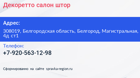 Декоретто, салон штор по адресу 308019, Белгородская область, Белгород, Магистральная, 4д ст1 в дальнейшем Организация, размещена в следующих категориях: