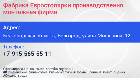 Фабрика Евростолярки, производственно-монтажная фирма по адресу Белгородская область, Белгород, улица Мишенина, 12 в дальнейшем Организация, размещена в следующих категориях: