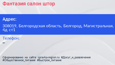 Фантазия, салон штор по адресу 308019, Белгородская область, Белгород, Магистральная, 4д ст1 в дальнейшем Организация, размещена в следующих категориях: