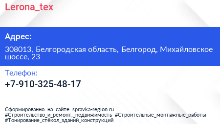 Lerona_tex по адресу 308013, Белгородская область, Белгород, Михайловское шоссе, 23 в дальнейшем Организация, размещена в следующих категориях: