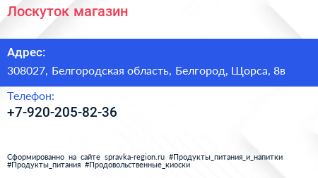 Лоскуток, магазин по адресу 308027, Белгородская область, Белгород, Щорса, 8в в дальнейшем Организация, размещена в следующих категориях: