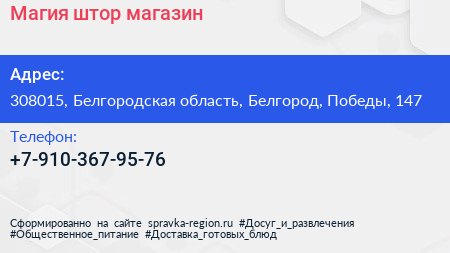 Магия штор, магазин по адресу 308015, Белгородская область, Белгород, Победы, 147 в дальнейшем Организация, размещена в следующих категориях: