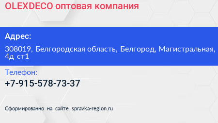 OLEXDECO, оптовая компания по адресу 308019, Белгородская область, Белгород, Магистральная, 4д ст1 в дальнейшем Организация, размещена в следующих категориях: