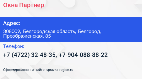 Окна Партнер по адресу 308009, Белгородская область, Белгород, Преображенская, 85 в дальнейшем Организация, размещена в следующих категориях: