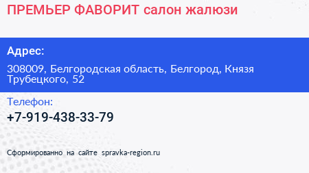 ПРЕМЬЕР-ФАВОРИТ, салон жалюзи по адресу 308009, Белгородская область, Белгород, Князя Трубецкого, 52 в дальнейшем Организация, размещена в следующих категориях: