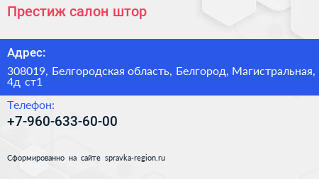 Престиж, салон штор по адресу 308019, Белгородская область, Белгород, Магистральная, 4д ст1 в дальнейшем Организация, размещена в следующих категориях: