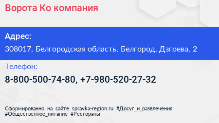 Ворота Ко, компания по адресу 308017, Белгородская область, Белгород, Дзгоева, 2 в дальнейшем Организация, размещена в следующих категориях: