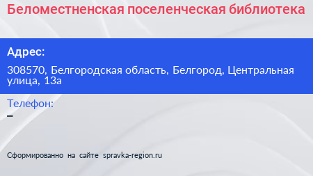 Беломестненская поселенческая библиотека по адресу 308570, Белгородская область, Белгород, Центральная улица, 13а в дальнейшем Организация, размещена в следующих категориях: