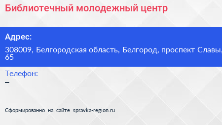 Библиотечный молодежный центр по адресу 308009, Белгородская область, Белгород, проспект Славы, 65 в дальнейшем Организация, размещена в следующих категориях: