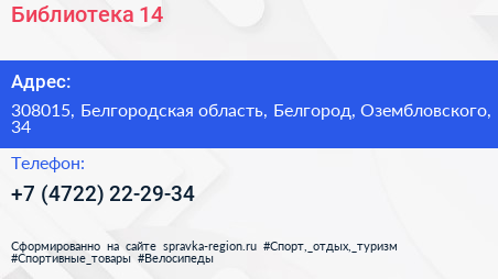 Библиотека №14 по адресу 308015, Белгородская область, Белгород, Озембловского, 34 в дальнейшем Организация, размещена в следующих категориях: