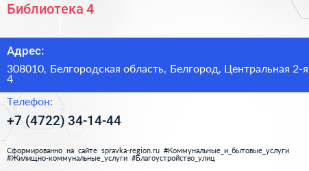 Библиотека №4 по адресу 308010, Белгородская область, Белгород, Центральная 2-я, 4 в дальнейшем Организация, размещена в следующих категориях: