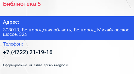 Библиотека №5 по адресу 308013, Белгородская область, Белгород, Михайловское шоссе, 32а в дальнейшем Организация, размещена в следующих категориях: