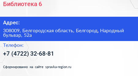 Библиотека №6 по адресу 308009, Белгородская область, Белгород, Народный бульвар, 52а в дальнейшем Организация, размещена в следующих категориях: