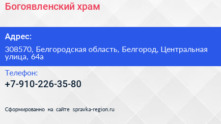 Богоявленский храм по адресу 308570, Белгородская область, Белгород, Центральная улица, 64а в дальнейшем Организация, размещена в следующих категориях: