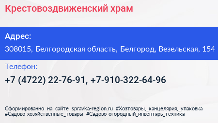 Крестовоздвиженский храм по адресу 308015, Белгородская область, Белгород, Везельская, 154 в дальнейшем Организация, размещена в следующих категориях: