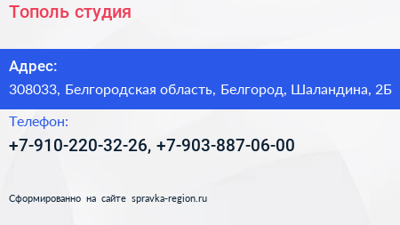 Тополь, студия по адресу 308033, Белгородская область, Белгород, Шаландина, 2Б в дальнейшем Организация, размещена в следующих категориях: