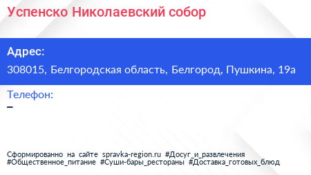 Успенско-Николаевский собор по адресу 308015, Белгородская область, Белгород, Пушкина, 19а в дальнейшем Организация, размещена в следующих категориях: