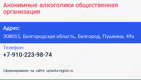 Анонимные алкоголики, общественная организация по адресу 308015, Белгородская область, Белгород, Пушкина, 49а в дальнейшем Организация, размещена в следующих категориях: