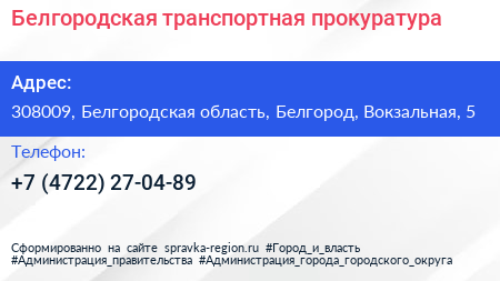 Белгородская транспортная прокуратура по адресу 308009, Белгородская область, Белгород, Вокзальная, 5 в дальнейшем Организация, размещена в следующих категориях: