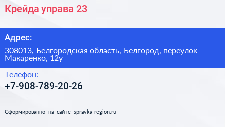 Крейда, управа №23 по адресу 308013, Белгородская область, Белгород, переулок Макаренко, 12у в дальнейшем Организация, размещена в следующих категориях: