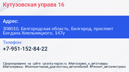 Кутузовская, управа №16 по адресу 308010, Белгородская область, Белгород, проспект Богдана Хмельницкого, 147у в дальнейшем Организация, размещена в следующих категориях: