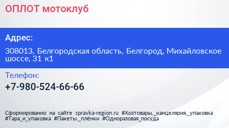 ОПЛОТ, мотоклуб по адресу 308013, Белгородская область, Белгород, Михайловское шоссе, 31 к1 в дальнейшем Организация, размещена в следующих категориях: