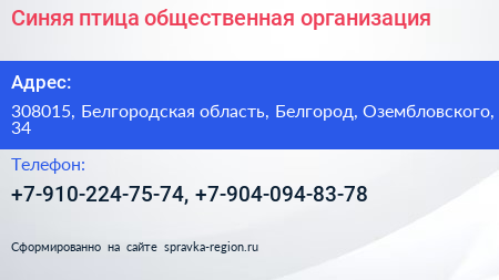 Синяя птица, общественная организация по адресу 308015, Белгородская область, Белгород, Озембловского, 34 в дальнейшем Организация, размещена в следующих категориях: