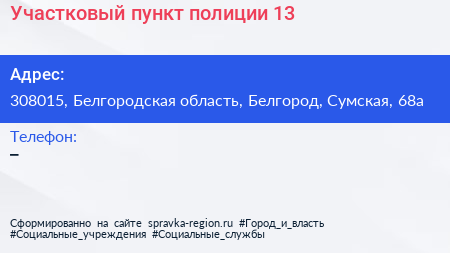 Участковый пункт полиции №13 по адресу 308015, Белгородская область, Белгород, Сумская, 68а в дальнейшем Организация, размещена в следующих категориях: