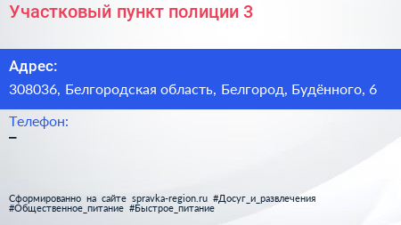 Участковый пункт полиции №3 по адресу 308036, Белгородская область, Белгород, Будённого, 6 в дальнейшем Организация, размещена в следующих категориях: