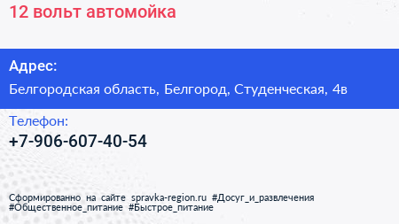 12 вольт, автомойка по адресу Белгородская область, Белгород, Студенческая, 4в в дальнейшем Организация, размещена в следующих категориях: