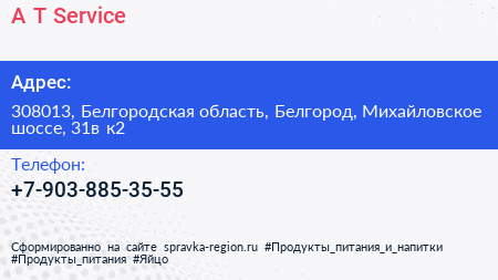 A & T Service по адресу 308013, Белгородская область, Белгород, Михайловское шоссе, 31в к2 в дальнейшем Организация, размещена в следующих категориях: