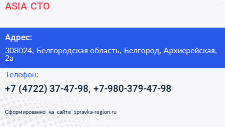 ASIA, СТО по адресу 308024, Белгородская область, Белгород, Архиерейская, 2а в дальнейшем Организация, размещена в следующих категориях: