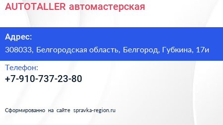 AUTOTALLER, автомастерская по адресу 308033, Белгородская область, Белгород, Губкина, 17и в дальнейшем Организация, размещена в следующих категориях: