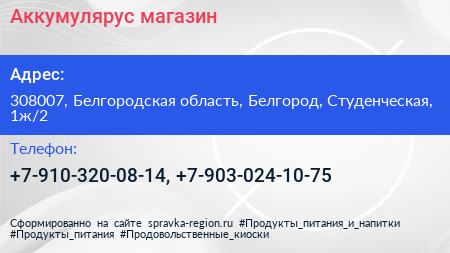 Аккумулярус, магазин по адресу 308007, Белгородская область, Белгород, Студенческая, 1ж/2 в дальнейшем Организация, размещена в следующих категориях: