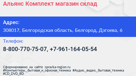 Альянс-Комплект, магазин-склад по адресу 308017, Белгородская область, Белгород, Дзгоева, 6 в дальнейшем Организация, размещена в следующих категориях:
