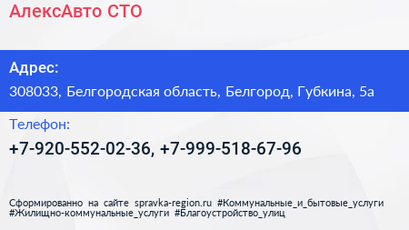 АлексАвто, СТО по адресу 308033, Белгородская область, Белгород, Губкина, 5а в дальнейшем Организация, размещена в следующих категориях: