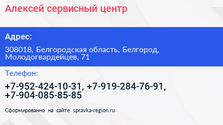 Алексей, сервисный центр по адресу 308018, Белгородская область, Белгород, Молодогвардейцев, 71 в дальнейшем Организация, размещена в следующих категориях: