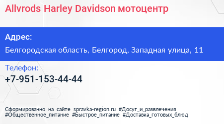 Allvrods Harley-Davidson, мотоцентр по адресу Белгородская область, Белгород, Западная улица, 11 в дальнейшем Организация, размещена в следующих категориях: